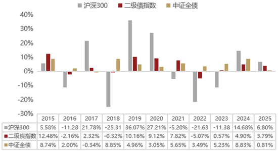 不仅波动小,二级债基指数在2016、2018年等沪深300指数表现为负的阶段也表现出较强抗跌能力。如果对比中证全债指数会发现,二级债基指数在股市上涨时的收益弹性也不容小觑,尤其在2019-2021年以及2025年以来均有十分亮眼的表现。
