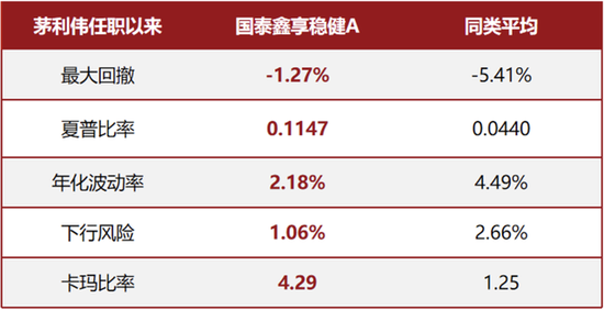 以其在管的代表产品国泰鑫享稳健A为例,作为一只股债搭配的固收+产品,自茅利伟接手以来,该产品的区间最大回撤仅1.27%,远低于同期同类产品5.41%的平均最大回撤数据,且夏普比率、卡玛比率等风险指标同样表现出色,真正做到了在市场波动时让持有人尽可能少的产生颠簸感。