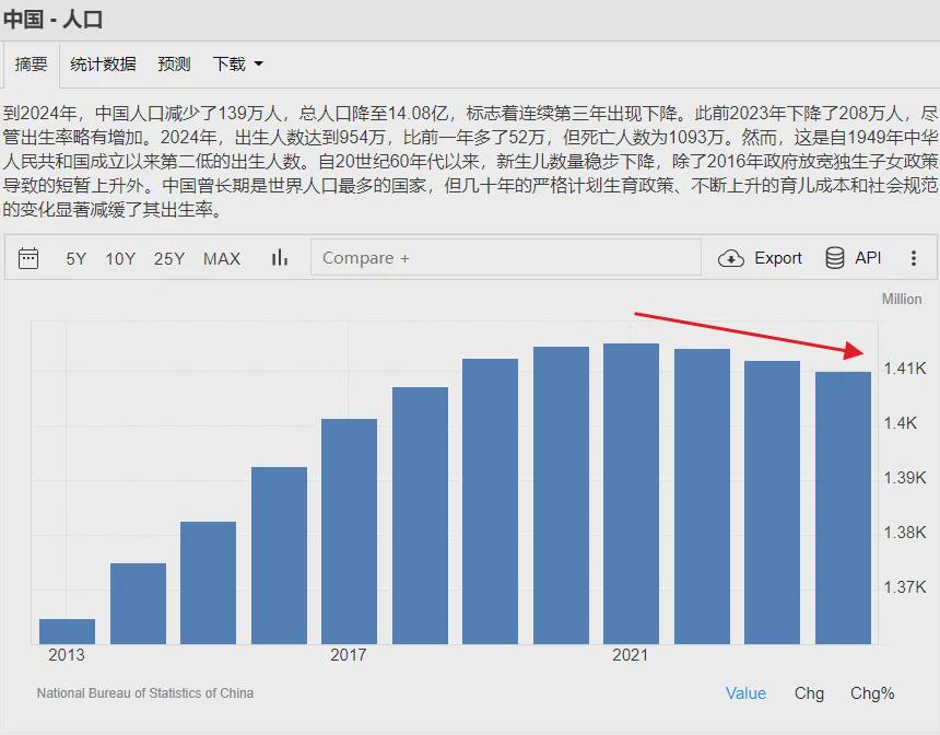 2021年,中国人口增量创新低,2022年正式见顶开始负增长,当年减少了85万人,2023年加速减少,减少了208万人。
